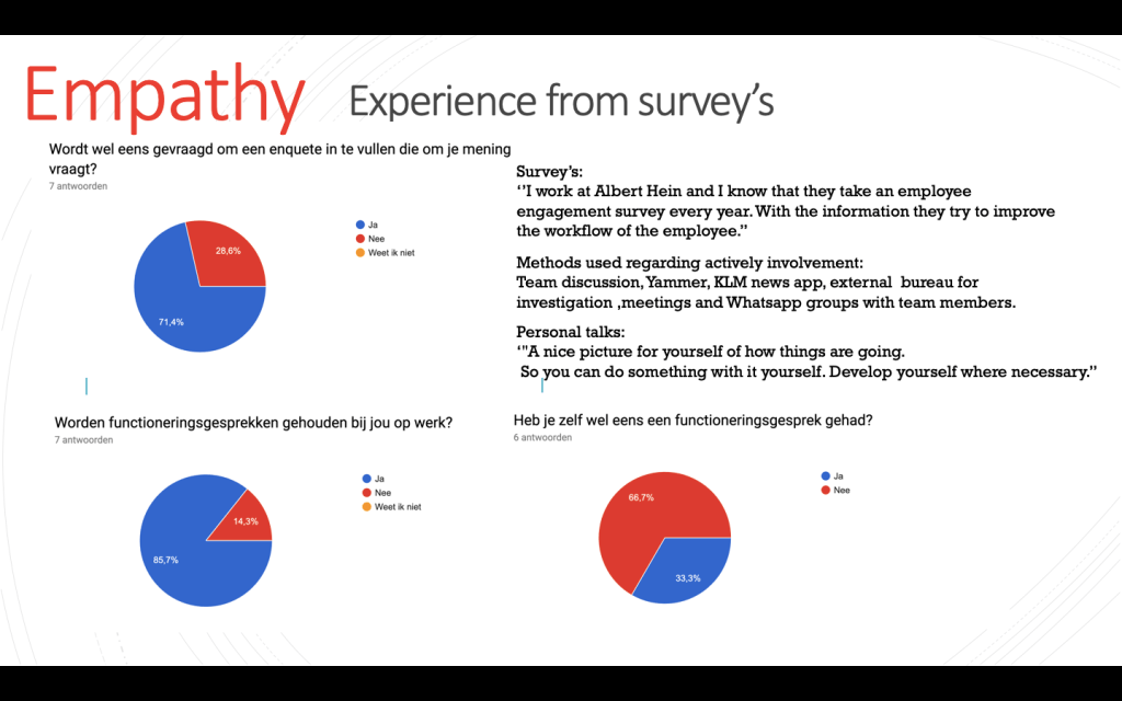 Survey’s were a quick and easy tool to receive small answers from different sources. Quantitively speaking it was efficient. I discovered that personal talks are only common under employees with a permanent contract. And employees that don’t have a permanent contract mostly have to rely on employee satisfaction survey’s or other methods. By asking what alternative methods where used to ensure the employee satisfaction, I got a quick overview of the existing methods. That is how i got to the top five alternatives down below.