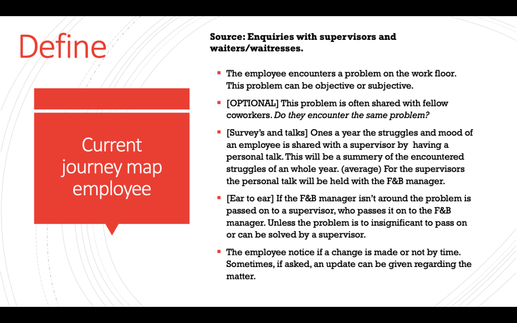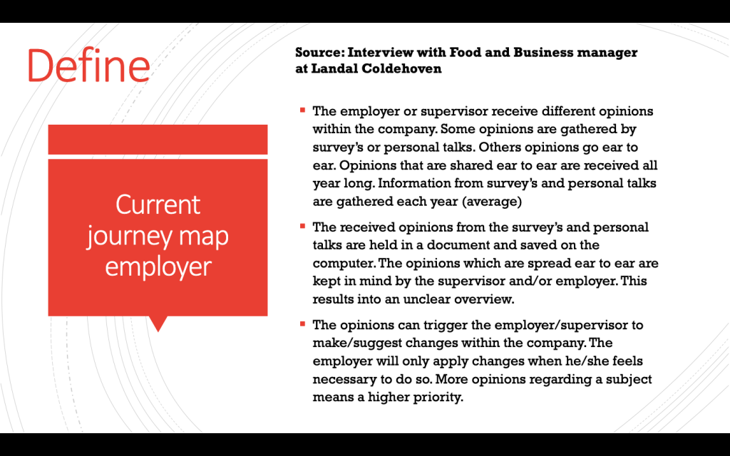 To define this user need statement further, two journey maps are made. One for the employee and one for the employee.