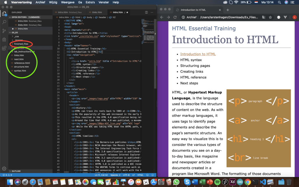 The picture below shows the way I made the challenges. At first I didn’t know how to show my site in the browser, so I made the practising code (green) and compared it with the finished files (red). The screen on the right side didn’t update, every time I want to see my progress in the web browser, I needed to reopen the file.