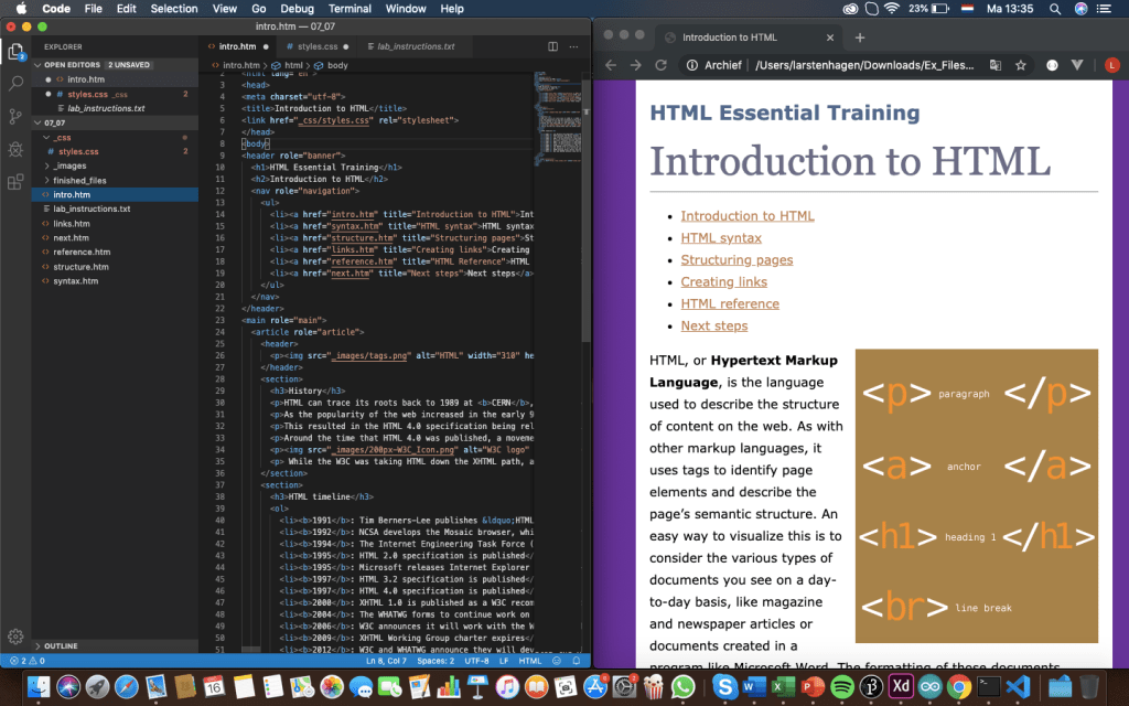 The link below will bring you to the LinkInLearning webpage of the HTML course I followed. I watched all the videos and did the practise exams. When I look back on what I learn during the course. I could say that not all features where that important for the building of my app. The course went in on carefully structuring all the content of the codes, I found that to be less important than the all the visual aspects of HTML.