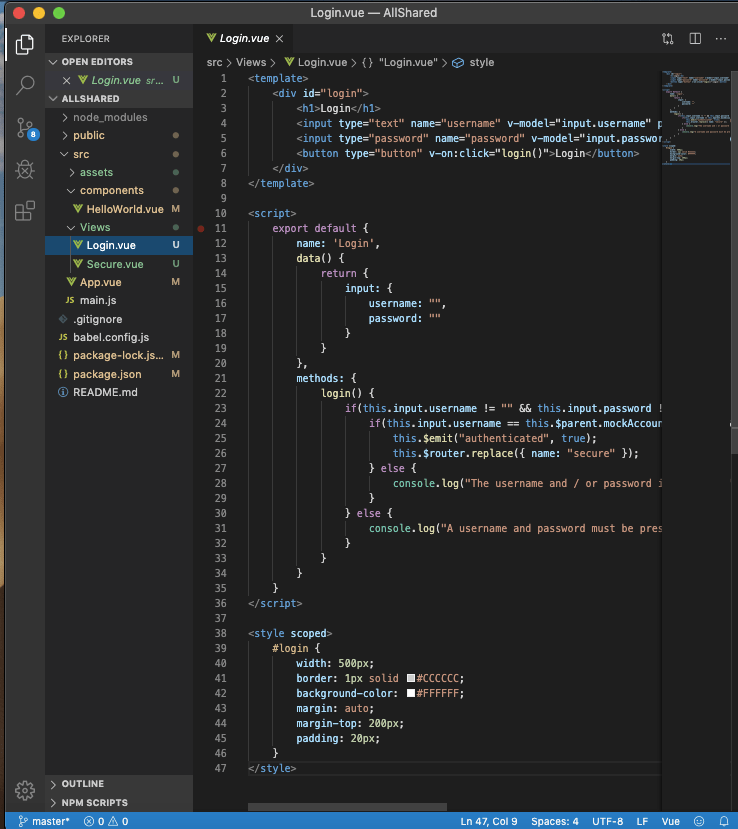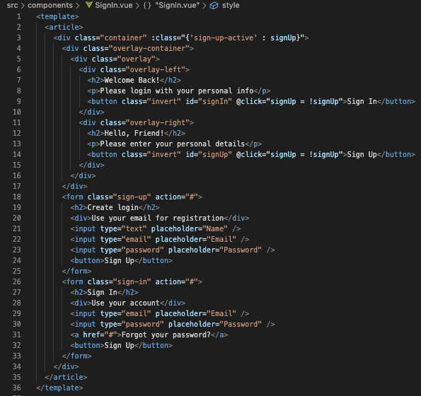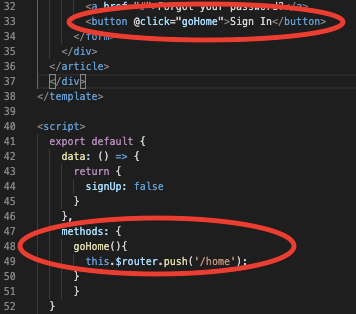 The article explains how he setup a simple login page from one page to the next one. The publisher also used VUE. The code he made is shown and he explains every step. Because of the HTML and CSS knowledge I acquired in the last step I know where to put the different codes in order to make it work in my app.