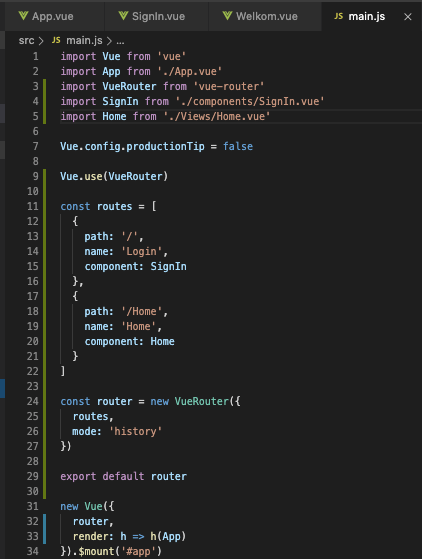 When the Sign In button is pressed it will bring the user to the home page. In order to connect the page to the next page I tried out a multiple page approach and a single page approach. Eventually I chose for a single page approach with help of a Vue router. This could be aded as a plugin within the Vue CLI. More research information about the router option and navigation from the home page can be found in the next post.