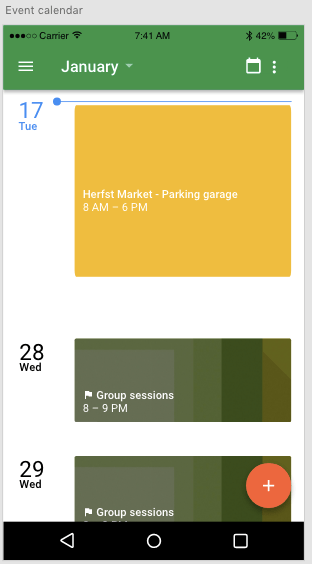 In this part of the project I am going to tell you how I managed to get a working agenda in the app. In the picture below you can see a standard layout of what I imagent such a event calendar will look like. This layout was made with adobe XD.